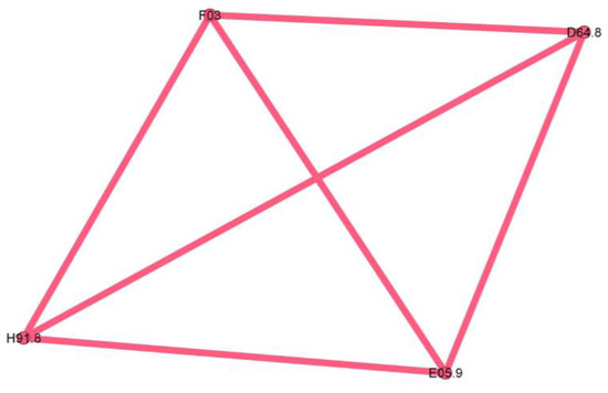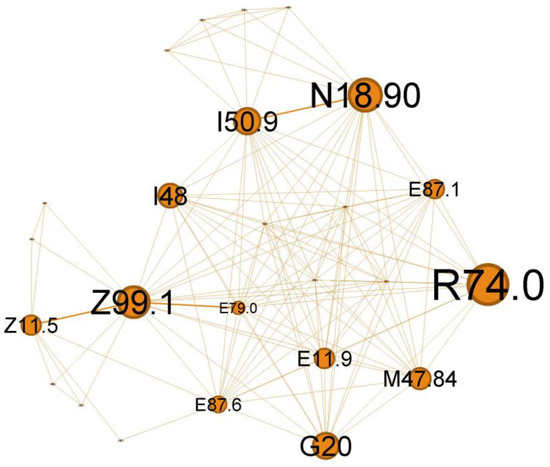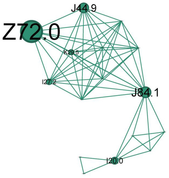 Diabetes mellitus (E11.8) is one the most substantial risk factors for cardiovascular disease and, in particular, for ischemic heart disease (I25.5) due to several underlying mechanisms: coronary stenosis, coronary microvascular disease, and dysfunctional ion channels [43]. I25.5 also has essential connotations in our cluster and represents an important relay in the above complex network, once again emphasizing the metabolic imbalance of diabetes.