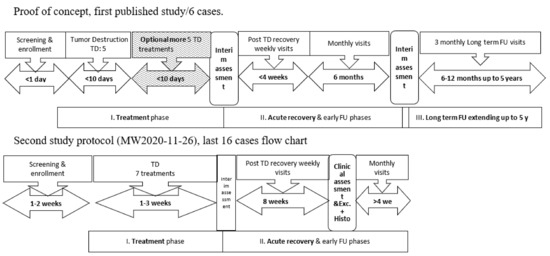 Schematic description of the study design. In the first proof-of-concept (POC) study, the enrollment (1 day) and treatment phases were shorter (no diagnostic histology and only 5–6 daily treatments) compared to the second study. The post-treatment phases were longer in the first POC study (excisional biopsy after 6 months for two lesions and follow up for >4 years) compared to the second study, where all underwent excisional biopsy after 2 months and follow-up until wound closure at 1 month. The third study, conducted in Israel, followed the same scheme as the second study in the US. The last two studies ended in wide-margin complete excisions without additional follow-up. The shaded area represents optional treatments that were only used on one of the lesions once (sixth application). TD: tumor destruction; FU: follow-up.