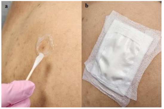 Interventions: In all patients, CPEEB with a concentration of 5% (4 g in 10 mL water) was applied topically under an occlusive dressing within an adhesive barrier made of Aquaphor (petrolatum ointment, Beiersdorf AG, Beiersdorfstraße 1-9, 22529 Hamburg, Germany) (Figure 2) or colostomy rings (Coloplast Brava Protective Seal) for a period of 8–12 h. Different occlusive dressings were used by the clinical sites. The volume of CPEEB applied was dependent on the volume of the occlusive chamber, which varied based on the thickness of the adhesive barrier around the treated site, the nature of the occlusive film, and the skin topography.
