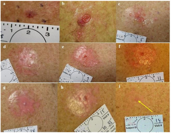 Group 1 lesion. (a) Nodular BCC pre-treatment, (b) post first treatment, (c) post treatment #2, (d) one day post treatment #3, (e) post treatment #4. (f) post treatment #5, (g) one day post treatment #6 and pre-treatment #7, (h) post treatment #7, (i) two months post last treatment, before excisional biopsy; see yellow arrow: clinical and histological clearing.