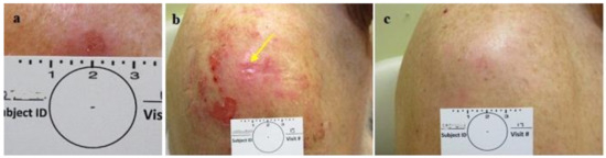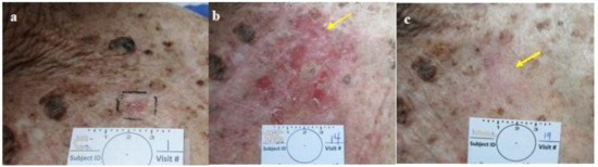 The post-treatment healing was uneventful and was completed in approximately 2 weeks, with minimal to no scarring. In some cases, the healed skin looked better than the surrounding untreated skin after 2 months, sometimes making it difficult to identify the treated lesion site for the diagnostic excisional biopsy (Figure 3, Figure 4, Figure 5, Figure 6 and Figure 7). In order to implement the conclusions gained with these 22 cases in a larger and more appropriately powered study, the planned study was stopped at the end of this phase without proceeding to the additional second phase of a daily application in 16 lesions.