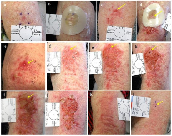 Group 3 lesions. (a). NBCC post shave biopsy, (b). #1 treatment, colostomy ring dressing applied. (c). Post first treatment, erosion of the lesion and its surrounding with downword leakage, (d). #2 treatment, leakage under a colostomy ring with the expected irritation of the exposed skin below the treated lesion, (e). Decreased CPEEB dosedue to leakage with decreased effect. (f). One day post second treatment (g). Post #3 treatment, marked leakage with reduced effect. (h). One day after #5 treatment (i), One day post #6 treatment (j). One day post #7 treatment, (k). Good healing at 2 weeks and (l). Treated area after 2 months before excisional biopsy that was positive for suspected residual BCC in a scar. The arrows point to the treated tumor.
