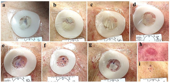 Group 3 lesions. Evaporation of the CPEEB water through the occluding film. Dry CPEEB crusts are seen on the film’s inner surface in all applications (a–g). At the end of the treatment (g), with a minimal, insuficient effect on the target lesion after last application (h) and surrounding skin, and the final outcome after 6 weeks before excisional biopsy (i).