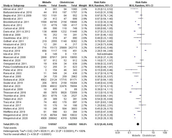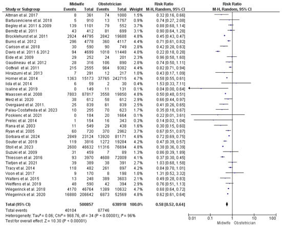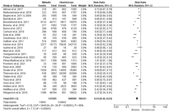 | Episiotomy | 28 | 584,496 | RR = 0.66 | [0.59, 0.73] | <0.001 * | p < 0.001, I2 = 95% |