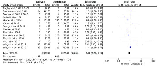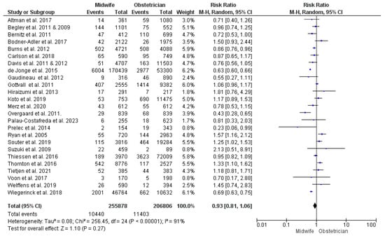 | Intact perineum | 13 | 25,338 | RR = 1.06 | [0.98, 1.15] | 0.16 | p < 0.001, I2 = 80% |