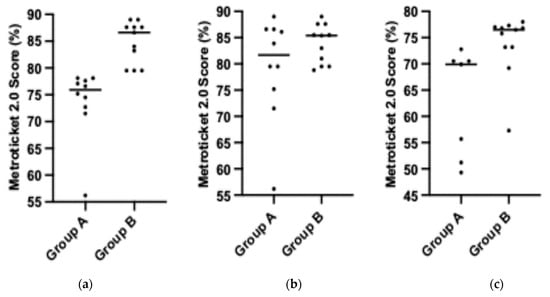 Metroticket 2.0 scores (%) in subgroups of the study cohort: (a) baseline scores (p < 0.0001); (b) liver transplantation scores (p = 0.4340); (c) explant scores (p = 0.0036).