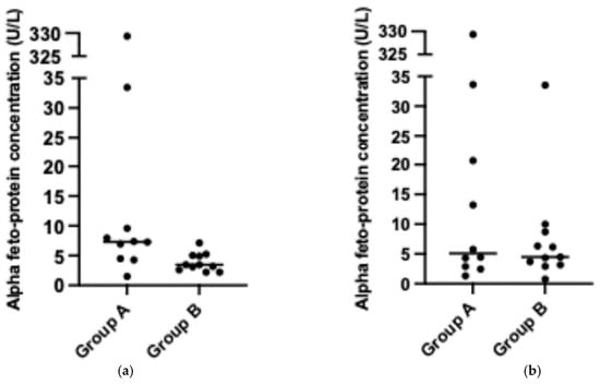 Alpha-fetoprotein concentration: (a) baseline (p = 0.012) and (b) at liver transplantation (p = 0.7564).