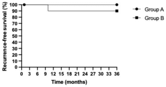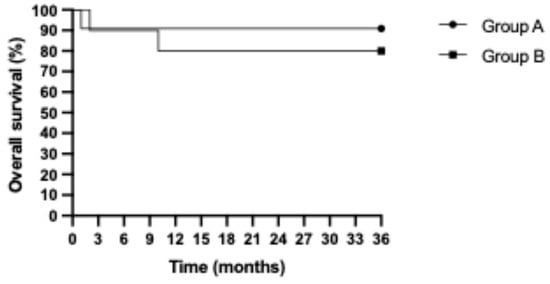The median follow-up length was 44.03 months. During the follow-up period, four patients died (two in each group). The details of the four patients who died are presented in Appendix A. The median OS was 42.71 months (43.55 months and 41.46 months in groups A and B, respectively). The three-year RFS and OS Kaplan-Meier curves are presented in Figure 3 and Figure 4, respectively. No statistically significant differences in three-year RFS (p = 0.3173) or OS (p = 0.5249) were detected in the group analysis. The recurrence-free survival rates were 100% and 90.91% in groups A and B, respectively. The overall survival was 80.0% and 81.81% in groups A and B, respectively.