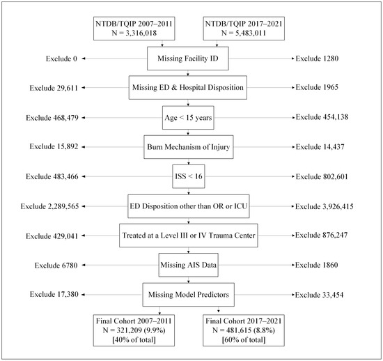 We conducted a two-armed cohort study using Trauma Quality Program Participant Use Files (TQP PUF) from the American College of Surgeons’ National Trauma Data Bank (NTDB) data from two five-year periods, 2007–2011 (early) and 2017–2021 (late). We included all severely injured patients within a larger trauma center cohort at all levels of trauma volume using the ACS TQIP and National Trauma Data Bank databases. The time periods were selected because they were the most recent five years available in TQIP/NTDB and five years from a decade earlier for comparison. The patient sample examined in this study included critically injured (ISS > 15 and admitted to the ICU or operating room from the emergency department) adults (age ≥ 15 years-old) treated at a facility capable of providing definitive care (Level I or II trauma center). By only including such severely injured patients, we posit that the resources of a trauma center are tested, and the effect of care is manifested most readily. We excluded patients whose records lacked a facility identifier, those with missing emergency department or hospital disposition data, patients missing Abbreviated Injury Scale records, and patients with missing data for model predictor variables. Patients with a mechanism of injury classified as burns were also excluded from this study due to differing injury physiology. A flow diagram illustrating the exclusion criteria with the number of patients excluded for each criterion is shown in Figure 1. The exposure of interest was a quintile of the average number of critically injured patients admitted to each trauma center per year, while the outcome of interest was the risk-adjusted, odds ratio (OR) of mortality among the Level I and II trauma centers contributing data during the time periods described above.