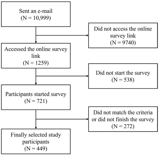 This study employed a cross-sectional design using an anonymous online survey, conducted from 7–12 June 2024, by Macromill Embrain (Embrain Co., Ltd., Seoul, Republic of Korea), a professional survey company. The company sent email invitations containing the survey link to registered panel members who potentially met the inclusion criteria. Macromill Embrain’s panel members are popular research participants in Republic of Korea, frequently involved in large-scale surveys [17,18,19]. Participants were paid a monetary incentive of approximately 0.1 USD per minute for completing this 10 to 15 min online survey [17]. This study was ‘strengthening the reporting of observational studies in epidemiology’ (STROBE)-statement compliant [20]. The inclusion criteria for this study were as follows: (1) Republic of Korea nationality and (2) born between 1980 and 2005. Exclusion criteria included the following: (1) without serious physical illness (such as angina, myocardial infarction, cerebral hemorrhage, cerebral infarction, and cancer) and (2) without serious mental illness (such as depressive disorder, bipolar disorder, and dementia).