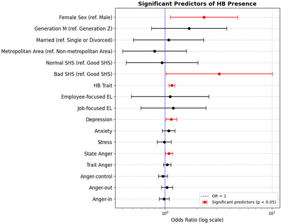 The regression analysis revealed that female sex (odds ratio [OR] = 2.314, 95% CI: 1.123–4.767, p = 0.023) was a significant predictor of HB presence compared to male sex. Participants who reported ‘bad or very bad’ subjective health states had a higher OR of HB (OR = 3.207, 95% CI: 1.020–10.084, p = 0.046) compared to those reporting ‘good or very good’. In addition, the HB trait score (OR = 1.155, 95% CI: 1.085–1.230, p < 0.001), depression (OR = 1.145, 95% CI: 1.018–1.287, p = 0.024), and anger states (OR = 1.087, 95% CI: 1.005–1.176, p = 0.038) were significant predictors of HB presence (Table 2, Figure 2).