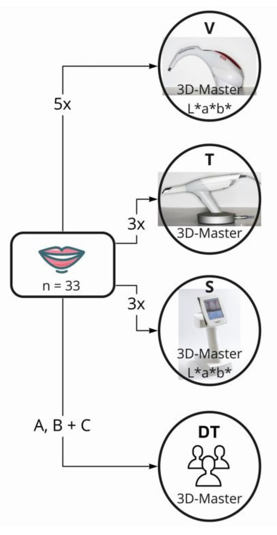 The measurements from V were used as the reference for validity, and five direct measurements were taken for each participant [10,22,30,34]. In contrast, three measurements were taken with the SpectroShade Micro (S) and T due to the longer time required to obtain the measurements in clinical settings. For T, a laboratory order must be created in the software for each scan, and a larger area needs to be scanned and recalculated. In clinical practice, tooth shade determination is only carried out once, in addition to scanning the preparation. Arithmetic mean values were calculated for all measurements. In addition, visual tooth shade determination was performed by three DTs to assess inter-rater reliability (reproducibility) (Figure 3). The absence of color vision deficiencies in the DTs was confirmed through anamnesis.