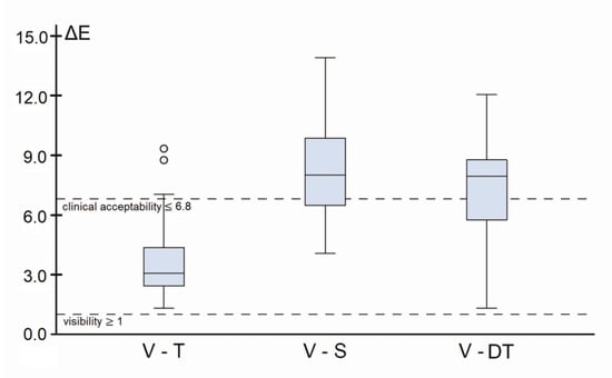 Boxplot of color difference in ΔE as validity. The threshold of visibility is shown as the lower limit at ΔE = 1. The threshold of clinical acceptability is defined as ΔE = 6.8 [30]. Outliers are marked as small circles.