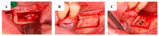 Before surgery, patients rinsed with a 0.2% chlorhexidine solution for 1 min. Under local anesthesia, following full-thickness flap preparation, a midcrestal osteotomy was performed. Two vertical releasing osteotomies were performed at the mesial and distal ends of the midcrestal osteotomy. Apically, a superficial corticotomy was carried out to connect the vertical osteotomies horizontally. Bone management was performed using a piezoelectronic device (NSK Variosurg3 Ultrasonic Bone Surgery System, NSK Europe GmbH, Eschborn, Germany). These osteotomies enabled the green-stick fracture of the buccal cortical. With this mobilization of the buccal cortical, we developed the recipient site for the bone block between the buccal and lingual cortical plates (Figure 1B). The autologous bone was harvested from the retromolar area (Figure 1A) from the same flap used to access the recipient site. The bone block was immobilized at the recipient site using osteosynthesis screws (MSS10 100; Meisinger Screw System, Hager and Meisinger GmbH, Neuss, Germany) (Figure 1C). Tension-free primary closure was obtained by mobilizing the lingual and buccal flaps. Two-layer flap closure was performed with horizontal mattress sutures and single interrupted sutures. Suture removal took place after 14 days [12].