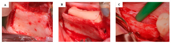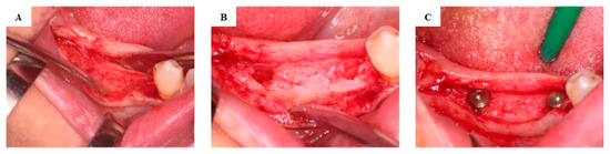 Re-entry in the test group after 3 months of healing. The augmented alveolar ridge following the elevation of the full-thickness flap (A). Implant osteotomies (B). The dental implants placed in the augmented bone (C).