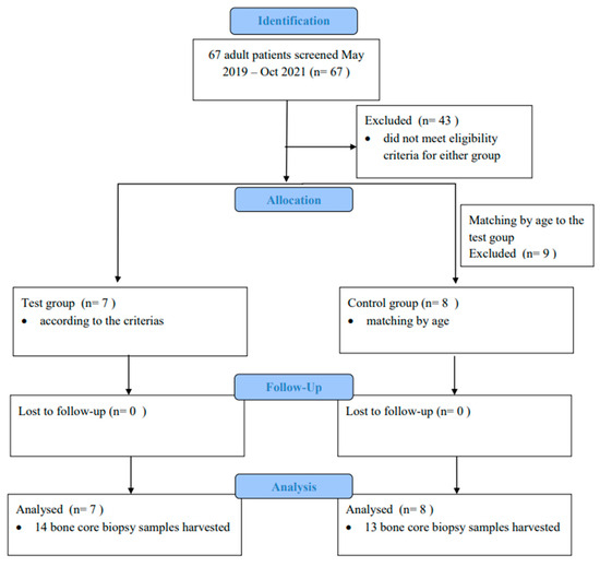 The flow diagram for this study is presented in Figure 5. Seven patients were included in the test group (two males, five females; mean age of 54.86 years ± 9.62 years; 14 bone core biopsy samples harvested), while eight patients were allocated to the control group (five males, three females; mean age 53.25 years ± 15.06 years; 13 bone core biopsy samples harvested). Demographic data of the patients included in this study are presented in Table 2.