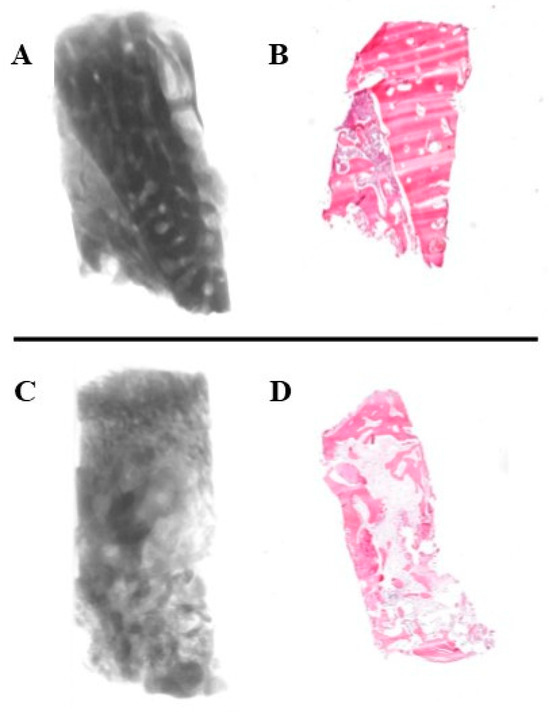 Currently, histomorphometry is the gold standard for bone microarchitectural analysis [20,21]. Histomorphometry provides information on cellularity and tissues. However, it is a destructive process and does not allow for the assessment of the three-dimensional trabecular structure of the bone. Micro-computed tomography (micro-CT) allows direct three-dimensional analysis of bone structures; therefore, it is considered in the literature as an additional non-destructive imaging modality to study trabecular microarchitecture [22].