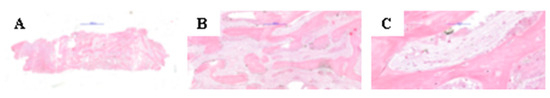 Histological appearance of the augmented bone of the control group without any signs of inflammation. Magnification 2× (A), 10× (B), and 40× (C).
