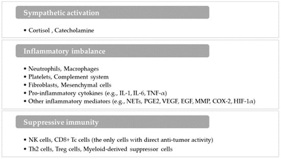 Ideally, the immune system would eliminate residual cancer cells after surgery [2]. However, surgical interventions often exacerbate pathophysiological changes that hinder this process. The surgical stress response plays a crucial role in disrupting inflammatory balance, resulting in immunosuppression [3,4]. Additionally, the preoperative period, characterized by patient anxiety and stress, can elevate cortisol and catecholamine levels, leading to reduced natural-killer (NK) cell activity and weakened immune readiness. The postoperative period also poses challenges, such as pain, surgical site inflammation, and potential infections, which further compromise immune recovery and promote an environment conducive to tumor growth. These stressors collectively contribute to inflammatory and immune system alterations that affect cancer outcomes.