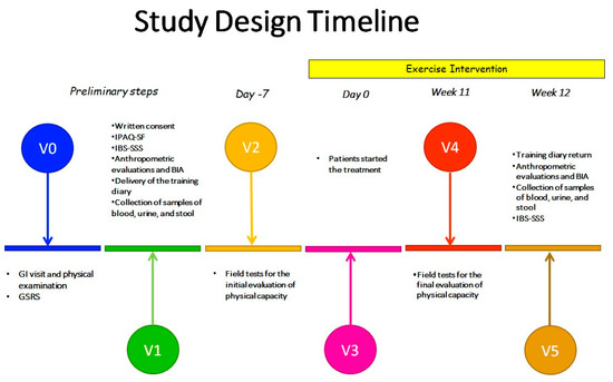 Study timeline. GI: gastrointestinal; GSRS: Gastrointestinal Symptom Rating Scale; IPAQ-SF: International Physical Activity Questionnaire—Short Form; IBS-SSS: Irritable Bowel Syndrome -Severity Scoring System; BIA: bioimpedance analysis; VO: preliminary screening; V1: initial visit and general evaluation; V2: field test initial evaluation; V3: start of the treatment; V4: field test final evaluation; V5: final evaluation.