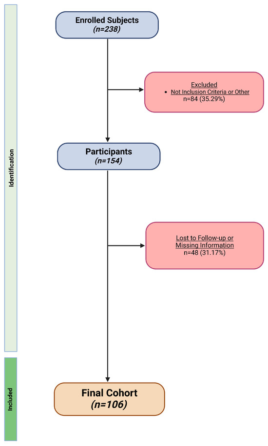 Out of the 238 subjects initially recruited, 84 (35.29%) were excluded because they did not meet the minimum required criteria. Among the remaining 154 enrolled participants, 48 (31.17%) did not complete the follow-up for different reasons (work or health problems, moved to another city, and/or missing information about any parameters). Ultimately, data from 106 participants were analyzed (Figure 3).