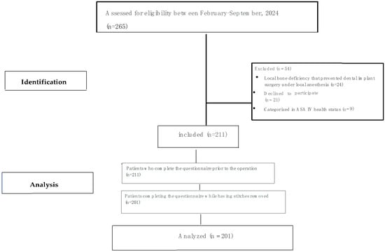 Two hundred and sixty-five patients who applied to Istanbul University Faculty of Dentistry, Department of Oral Implantology, for dental implant treatment were examined between February 2024 and September 2024. A total of 24 patients were excluded due to local bone deficiency that prevented dental implant surgery under local anesthesia. Furthermore, 9 patients were excluded due to being categorized in ASA IV health status. Of the remaining 232 patients, 21 refused to participate in the study and a total of 211 patients were included. Ten questionnaires were excluded from the analysis on the grounds that they had not been completed. Finally, 201 patients and 562 implants were included for analysis (Figure 1. Study flow chart).