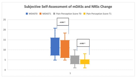 The mean baseline (T0) mDAS score for the patient cohort was 11.57 ± 4.85 (median: 11/IQR: 7), while T1 was 10.26 ± 3.99 (median: 11/IQR: 9). The change between the two-time intervals was found to be statistically significant (Wilcoxon signed-rank test p < 0.001). NRS scores were 5.26 ± 2.30 (median: 5/IQR: 4) and 3.88 ± 1.66 (median: 4/IQR: 2), respectively. The change between the two-time intervals was found to statistically significant (Wilcoxon signed-rank test p < 0.001) (Table 2, Figure 2). The distribution of mDAS and NRS scores over time stratified by study groups (healthy and comorbid) is presented in Table 3. The non-parametric test revealed a statistically significant reduction in mDAS scores among the study groups (Mann–Whitney-U test p = 0.028), while no statistically significant reduction was observed in terms of NRS scores (Mann–Whitney-U test p = 0.573).