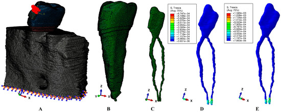 Timeline of the study: (A) 1 mm periodontal loss model with extrusion load, (B) mesh of the 2nd lower premolar with pulp and NVB, (C) mesh of dental pulp and NVB, (D) 2 N of extrusion color-coded stress distribution, (E) 4 N of extrusion color-coded stress distribution.