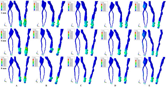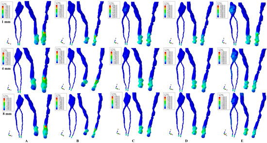 Comparative stress distribution for 4 N applied force (of one of the nine 3D models) in 1 mm, 4 mm, and 8 mm horizontal periodontal breakdowns: (A) extrusion, (B) intrusion, (C) rotation, (D) tipping, (E) translation.