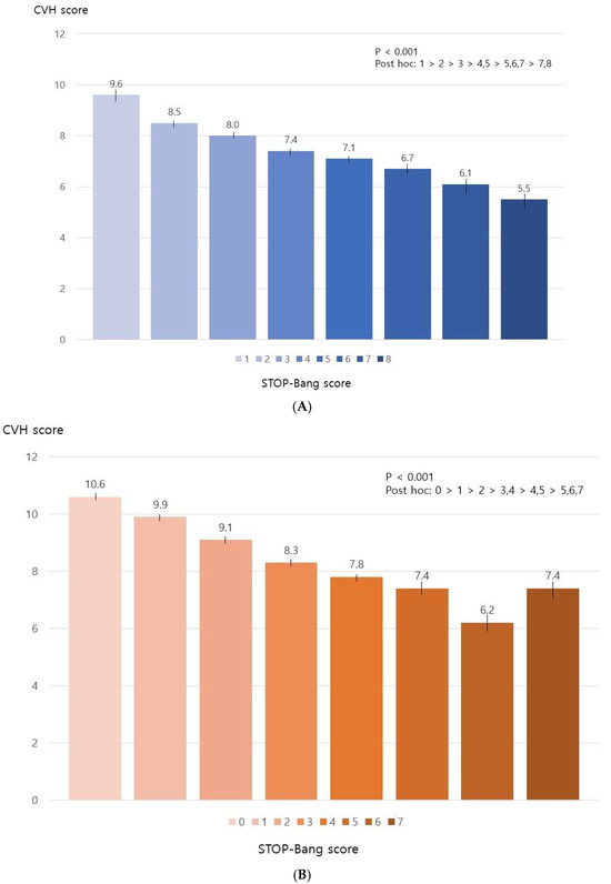 Figure 2 illustrates the mean CVH scores of the study participants in relation to their STOP-Bang scores. The mean CVH score tended to decline with increasing STOP-Bang score (p < 0.001). Table 2 presents the distribution of CVH status across the individual components of the STOP-Bang score. For both men and women, higher proportions of poor CVH were observed among participants who snored, who reported apnea being witnessed during sleep, who exhibited high blood pressure, who had a BMI greater than 30 kg/m2, and who displayed a neck circumference exceeding 36.3 cm. Furthermore, poor CVH was found in greater proportions among men who reported experiencing daytime tiredness, fatigue, or sleepiness and among women over 50 years old. Lastly, a greater percentage of participants with a higher risk for OSA also exhibited poor CVH (p < 0.05).