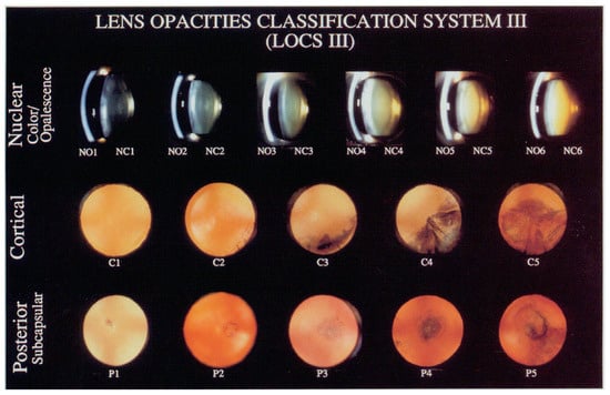 - Chylack Jr, L.T.; Leske, M.C.; McCarthy, D.; Khu, P.; Kashiwagi, T.; Sperduto, R. Lens Opacities Classification System II (LOCS II). Arch Ophthalmol 1989, 107, 991–997. [Google Scholar] [CrossRef]