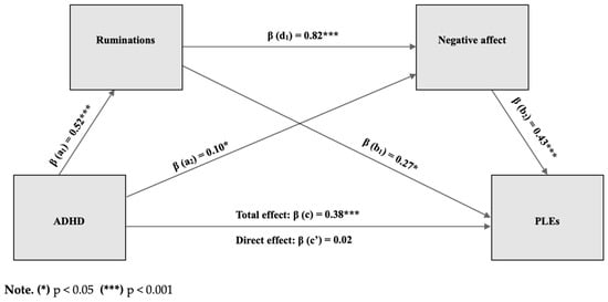 Rumination and negative affect mediate the relationship between ADHD symptoms and PLEs (serial mediation).