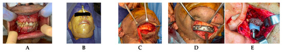 Surgical approach for eTMJR. (A) Occlusion is stabilized using IMF screws and wires. (B) Ioban isolation after draping. (C) Dissection from the submental region. (D) Fixation of the mandible component with alloplastic device. (E) Fixation of the fossa component with alloplastic device [16].
