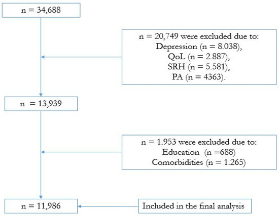 In the present study, citizens aged at least 50 were eligible, provided they had complete data from wave 7 (2017). The SHARE database presented 34,688 individuals aged 50 or older (see Figure 1 for a broad overview). However, we excluded participants with missing data for any variable of interest in the study (i.e., depression, QoL, SRH, PA), which determined the inclusion of 11,986 participants (6843 women) with complete data from 12 countries: Austria, Belgium, Czech Republic, Denmark, France, Germany, Greece, Italy, Poland, Spain, Sweden, and Switzerland.