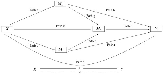 Our trajectory models showed nine direct effects. The complete model (see Figure 2 for better visualization) was composed of four submodels: Models 1 and Model 2 calculated the regressions of each of the parallel mediators M1 and M2 in X, respectively; Model 3 estimated the regression of M3 simultaneously on X, on M1 and M2; and Model 4 determined the regression from X to Y in M1, in M2 and M3. Specific indirect effects (SIEs) were also estimated. This procedure calculated the product of path coefficients based on a sequence: SIE1 = a×b, SIE2 = a×g×d, SIE3 = c×d, SIE4 = e×f, SIE5 = e×h×d. Moreover, we calculated the total indirect effect = SIE1 + SIE2 + SIE3 + SIE4 + SIE5.