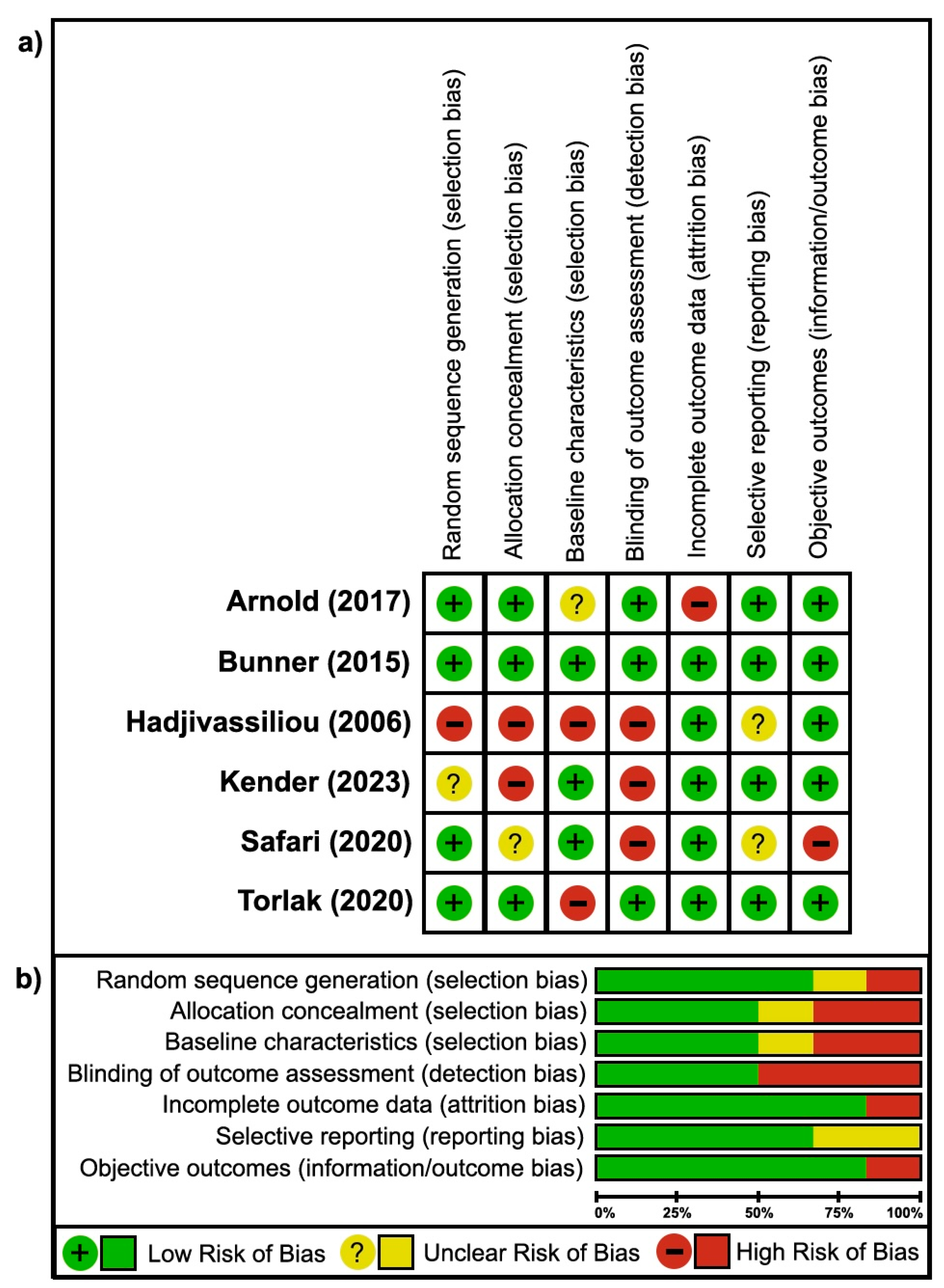 | NSS | Pre: 5.4 ± 0.8 Post: 4.1 ± 1.0 | Pre: 5.5 ± 0.9 Post: 5.6 ± 0.9 | 31 (1 study) | ⨁⨁◯◯ Low | Kender et al. (2023) did not report statistically significant findings. |