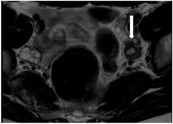 Patient 1. Magnetic resonance imaging (MRI) (T2-TSE-TRA) showing left uterine rudiment (arrow).