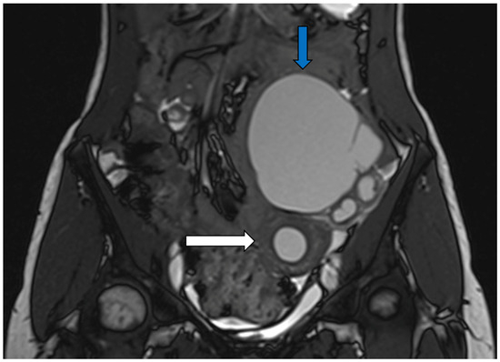 Patient 20. MRI (T2-TSE-COR) showing uterine rudiment (white arrow) and left haematosalpinx (blue arrow).