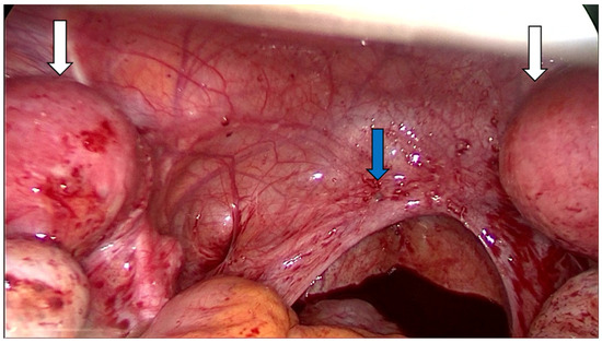 Patient 15. Bilateral uterine rudiments (white arrows) and peritoneal endometriosis (numerous clear vesicular lesions; adhesions; and the blue arrow indicates a blue lesion)—laparoscopic view.
