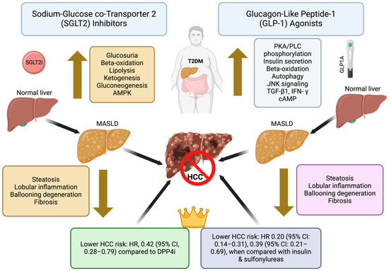SGLT2 inhibitors, primarily used for managing type 2 diabetes (T2DM), improve glycemic control and reduce insulin resistance, both of which are implicated in the development of HCC, as shown in the mechanisms summarized in Figure 1. These agents also exert anti-inflammatory and anti-fibrotic effects, helping to reduce liver damage, particularly in patients with MASLD [115]. Emerging studies suggest that SGLT2 inhibitors may lower the risk of HCC by improving non-invasive markers of steatosis and even fibrosis in patients with T2DM [116]. Recently, a large retrospective cohort study from Hong Kong compared the risk of new-onset HCC in patients with T2DM treated with SGLT2 inhibitors versus dipeptidyl peptidase-4 inhibitors (DPP4i). After propensity score matching and adjustments, SGLT2-inhibitor use was associated with a significantly lower risk of HCC (HR, 0.42; 95% CI, 0.28–0.79) compared to DPP4i, with this protective effect also observed in patients with cirrhosis, advanced fibrosis, HBV, and HCV infections. The findings were consistent across different risk models and sensitivity analyses [117].