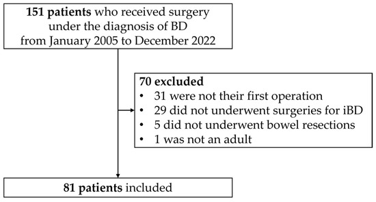 A total of 151 patients were pooled and 81 patients were included after excluding 70 patients (Figure 1). All patients were Asian. The mean ages at diagnosis of BD, diagnosis of iBD, and initial bowel resection were 39.4, 43.7, and 46.9 years, respectively (Table 1). Most patients were female (65.4%), and 21% had concurrent hematological disorders. Medical intractability was the most common reason for the initial bowel resection, accounting for 65.4% of the cases (Table 1).