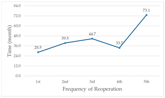 Mean time from initial surgery to reoperation by frequency of reoperations in 26 patients.