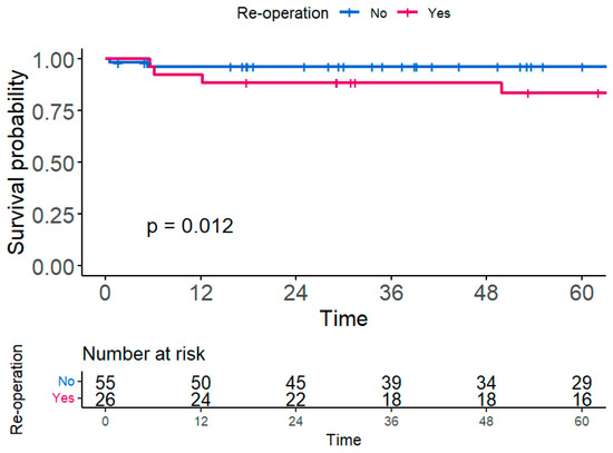 Of all patients, eight (9.9%) deaths occurred, five of whom died from postoperative infection, and the rest died from short bowel syndrome, septic colitis, and gastric BD bleeding. Patients who underwent reoperation had worse 5-year survivals than those who did not undergo reoperation (reoperation vs. no reoperation: 83.5% vs. 98.4%, p = 0.012) (Figure 3).