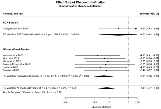 The analysis of the available data showed a mean IOP reduction of 3.43 mmHg (95% CI: −4.77 to −2.09) six months after phacoemulsification (Figure 3). The observed I2 is equal to zero, indicating that statistical heterogeneity is low.