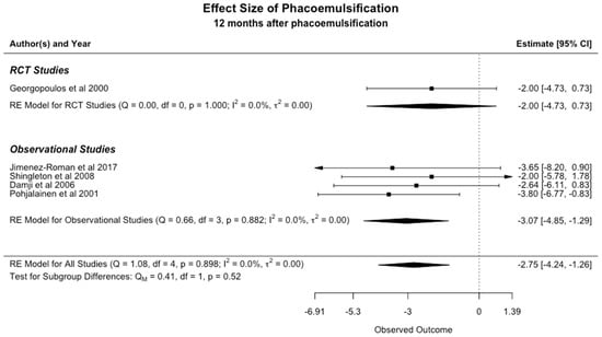 The analysis of the included studies revealed that the average IOP decreased by 2.75 mmHg (95% CI: −4.24 to −1.26) 12 months following phacoemulsification (Figure 4). The observed I2 value is zero, which indicates that there is no significant statistical heterogeneity.