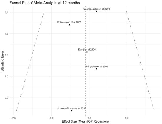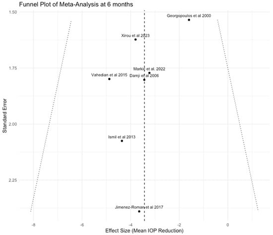 For both analyses at 6 and 12 months, we downgraded the certainty of the evidence by two levels because all the included studies, except for two [,], were graded as having a high risk of bias using the ROBINS-I tool []. In addition, the relatively small sample size and wide confidence intervals of the included studies may also lower the accuracy of the metanalysis results, leading us further to downgrade the level of evidence by one level. Lastly, the visual inspection of the funnel plots (Figure 5 and Figure 6) indicated that some small studies had reported a significant IOP reduction higher than 3 mmHg after phacoemulsification, but on the other hand, studies with lower or no effects on IOP are totally absent or may not have been published yet. This raises suspicions about the presence of publication bias, and thus, we chose to decrease the quality of evidence to yet another level. Considering all the above and having in mind that most studies included in our analysis were observational in design, which by default sets the initial quality of evidence to “Low”, we assessed the overall certainty of the evidence as “Very Low” at both time points (Table 4).