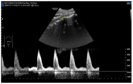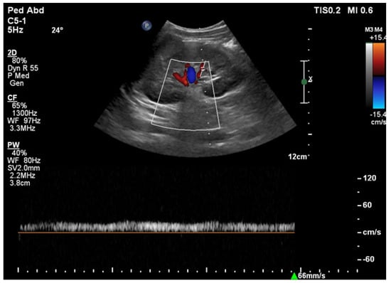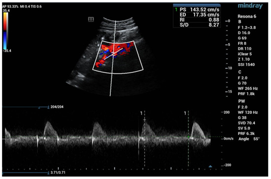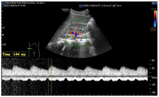 During ultrasound examinations to assess RAS, the Polish Society of Hypertension guidelines advocate for the evaluation of several key parameters. The renal-aortic ratio (RAR) is the ratio of the highest peak flow velocity along the renal artery, usually in the proximal segment (PSVr), to the highest peak velocity in the aorta at the level of the renal artery origin (PSVa). The maximum blood flow velocity in the renal arteries must always be considered in relation to the velocity in the abdominal aorta, where the range of the maximum velocities varies from 30 cm/s in people with circulatory failure or major atherosclerotic changes to 150 cm/s in young people with hyperkinetic circulation. It is essential to assess and compare the RAR for both renal arteries. The prolongation of acceleration time (AT) beyond 70 ms suggests flow disturbances in the prerenal segment, typically presenting unilaterally in unilateral RAS and bilaterally in conditions such as bilateral RAS, aortic stenosis, and MAS. The resistive index (RI), calculated from the peak systolic velocity (PSV) and the end-diastolic velocity (EDV) according to the formula (PSV—EDV)/PSV, is typically measured in the interlobar arteries. A RI difference exceeding 0.05 indicates unilateral stenosis, while bilateral stenosis shows a decrease in RI in both arteries below age-specific norms. Additional parameters, such as the pulsatility index (PI) and acceleration index (AI), are also valuable in the RAS assessment. The normal blood flow parameter values of the renal arteries according to the Polish Ultrasound Society guidelines are presented in Table 4 [48,49]. The recorded Doppler ultrasound examinations from our department are exhibited in Figure 2, Figure 3, Figure 4 and Figure 5.