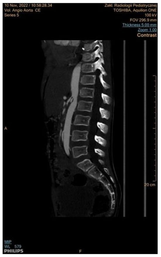 Typical MAS represents an extremely rare vascular anomaly. It presents as a segmental or diffuse narrowing of the abdominal aorta; however, in a minority of cases [3%], it primarily affects the distal part of the thoracic aorta. In the abdominal aorta, the suprarenal region is the most commonly affected site, followed by stenosis extending from suprarenal to infrarenal areas or occurring entirely in the interrenal section. An exclusively infrarenal involvement is the least frequent occurrence [11].