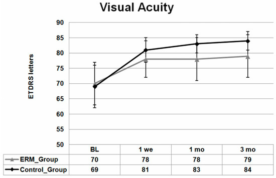 The baseline mean ± SD BCVA in the ERM group was 70 ± 7 ETDRS letters, which improved significantly to 78 ± 6 ETDRS letters 1 week after cataract surgery (p < 0.001) and stayed relatively stable at the 1 and 3 months follow-up visits; 78 ± 6 and 79 ± 7 ETDRS letters for 1 and 3 months, respectively, (difference baseline/1 and 3 months: all p < 0.001).