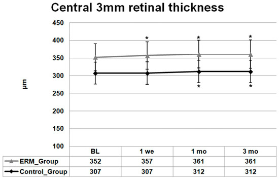 Mean ± standard deviation (SD) changes from baseline central 3 mm retinal thickness values of both groups over 3 months. Asterisks indicate a significant difference between baseline and each follow-up visit examination (p ≤ 0.05).
